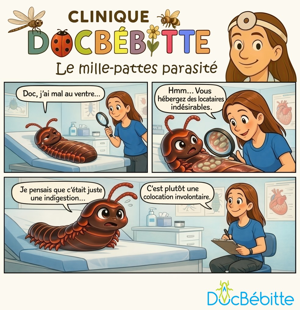 J’y parlais, bien sûr, des mille-pattes, mais aussi de la petite faune qui gravite autour d’eux… y compris deux invertébrés plutôt particuliers, et franchement pas invités!