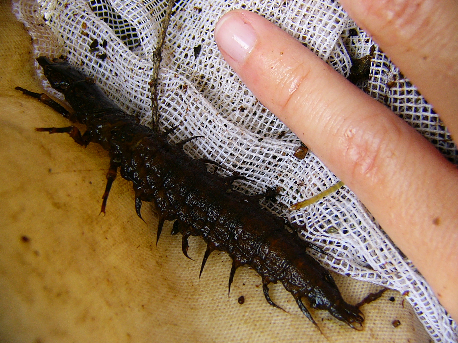 Pour ce premier article, je vous parle d’un des plus gros d’entre eux: les corydales, de l’ordre des Mégaloptères (Famille: Corydalidae). En fait, pour être précise, je devrais vous parler de larves de corydales, puisque ce sont les juvéniles qui vivent en milieu aquatique. Une fois près de la maturité, les larves se métamorphosent en adultes ailés… et terrestres! Le processus est similaire à la chenille qui se transforme en papillon, exception faite que les corydales vont complètement changer de milieu! Aussi, les larves peuvent prendre jusqu’à trois ans pour se développer sous l’eau… alors que l’adulte ne va survivre qu’une saison, le temps de se reproduire!