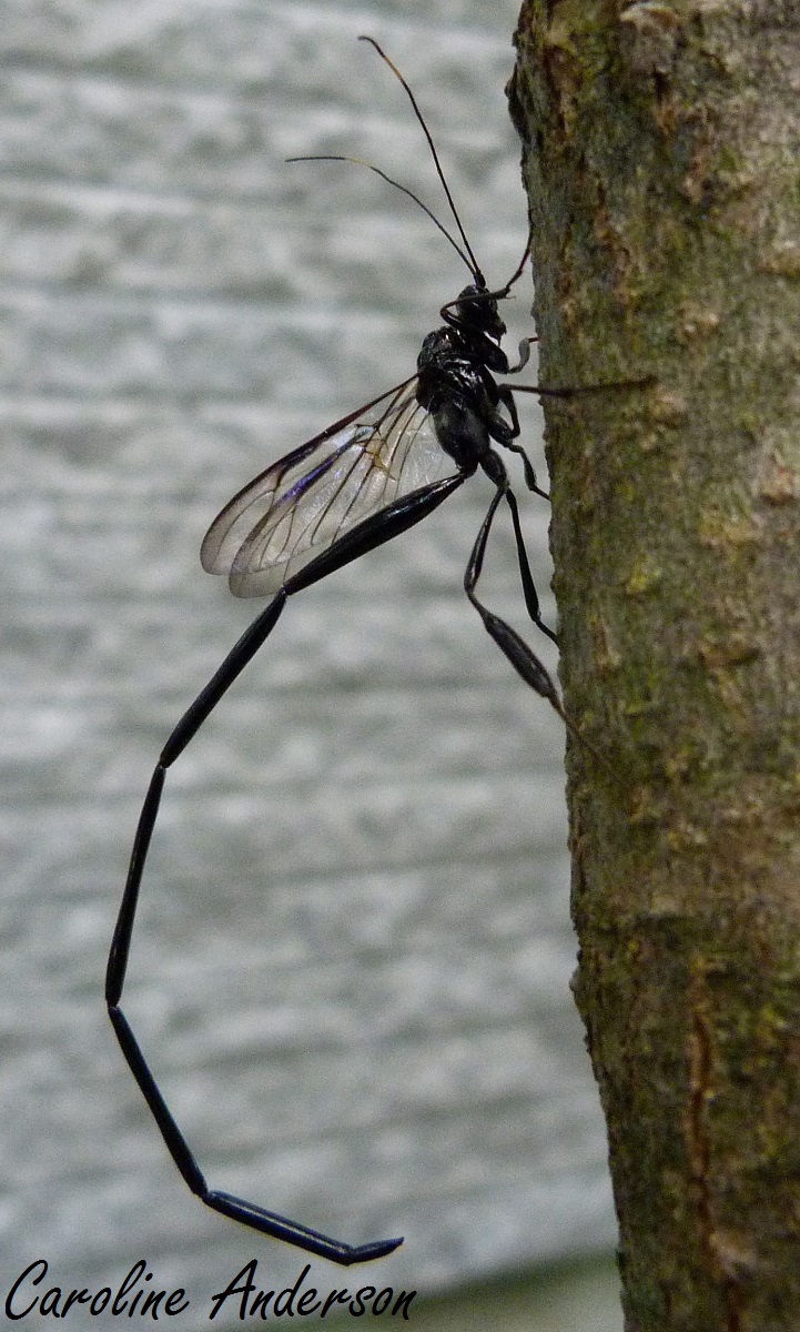 Cela dit, j’avais déjà rescapé une femelle pélécinide de la noyade dans ma piscine il y a quelques années. L’insecte avait rampé jusqu’à mon doigt (photo à l’appui!) et, à cette époque, je n’avais pas été très brave. Je m’étais dépêchée pour trouver une feuille sur laquelle la déposer. Il ne s’était rien passé, mais je ne faisais pas trop confiance à ce long appendice! Fait intéressant, deux des sources que j’ai consultées mentionnent que les femelles pélécinides peuvent faire mine de vouloir vous piquer avec leur ovipositeur si elles sont perturbées. Bien qu’elles ne puissent causer aucun dommage, je dois avouer qu’il s’agit d’une bonne technique pour se faire ficher la paix!