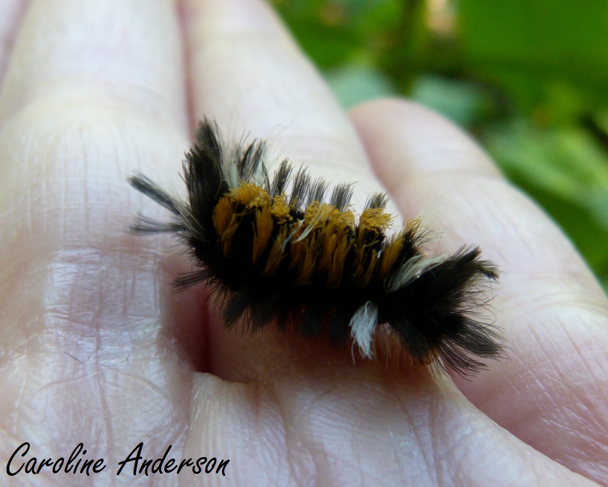 En revanche, un mois plus tard, j’ai manipulé une petite chenille jaune toute mignonne qui semblait inoffensive (chenille à houppes jaunes; Orgyia definita). Elle portait des poils de couleurs et de longueurs variables et était très intrigante à regarder. Je n’eus aucune réaction en la prenant dans mes mains. Ce n’est qu’au moment d’écrire la présente chronique que je pus lire, sur Bug Guide, un avertissement sur les poils des chenilles du genre Orgyia. À ce qu’il semble, ces poils sont reconnus comme ayant le potentiel de créer des irritations cutanées. Il en est de même pour une jolie chenille orange, noire et blanche – l’arctiide de l’asclépiade (Euchaetes egle) – que je manipulai aussi l’été dernier sans aucune réaction. Pourtant, elle est identifiée sur Wikipédia comme étant urticante. C’est également le cas de la très commune Isia Isabelle qui, bien que ne posant pas de problèmes chez la majorité des gens, peut causer des irritations chez des personnes plus sensibles selon Espace pour la vie. Ce n’est pas mon cas, par chance! Bref, ce n’est pas parce que les chenilles semblent inoffensives qu’elles le sont réellement. J’ai été chanceuse jusqu’à maintenant de ne pas me révéler sensible à tous ces poils!