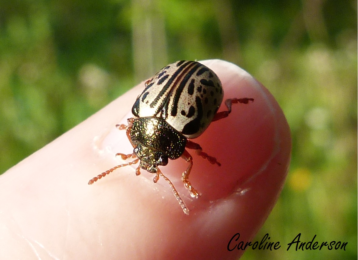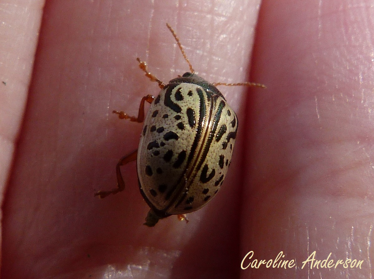 En m’approchant des arbustes, j’aperçu effectivement les deux suspects en plein délit : des coléoptères! Le premier, en nombre plus modeste (deux ou trois par plants), était un calligraphe ligné du cornouiller (Calligrapha philadelphica). Tout à fait à propos, puisque les arbustes endommagés étaient des cornouillers! Ce dernier était de taille assez grande – je dirais légèrement plus gros qu’une coccinelle – et de couleur dorée. Difficile de rater ce charmant coléoptère qui s’avérait également orné de jolis motifs plus sombres.
