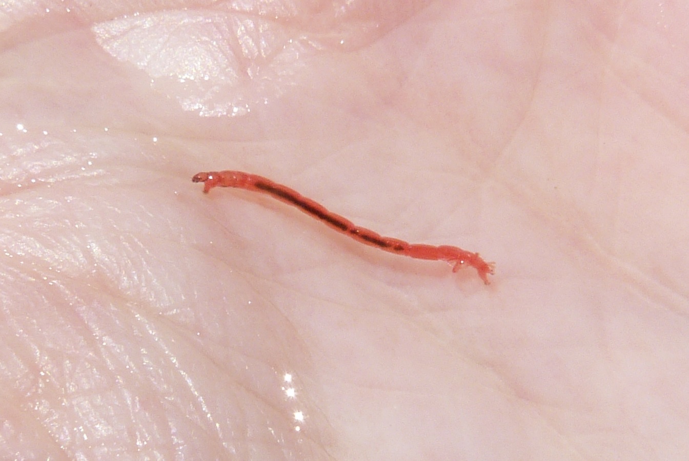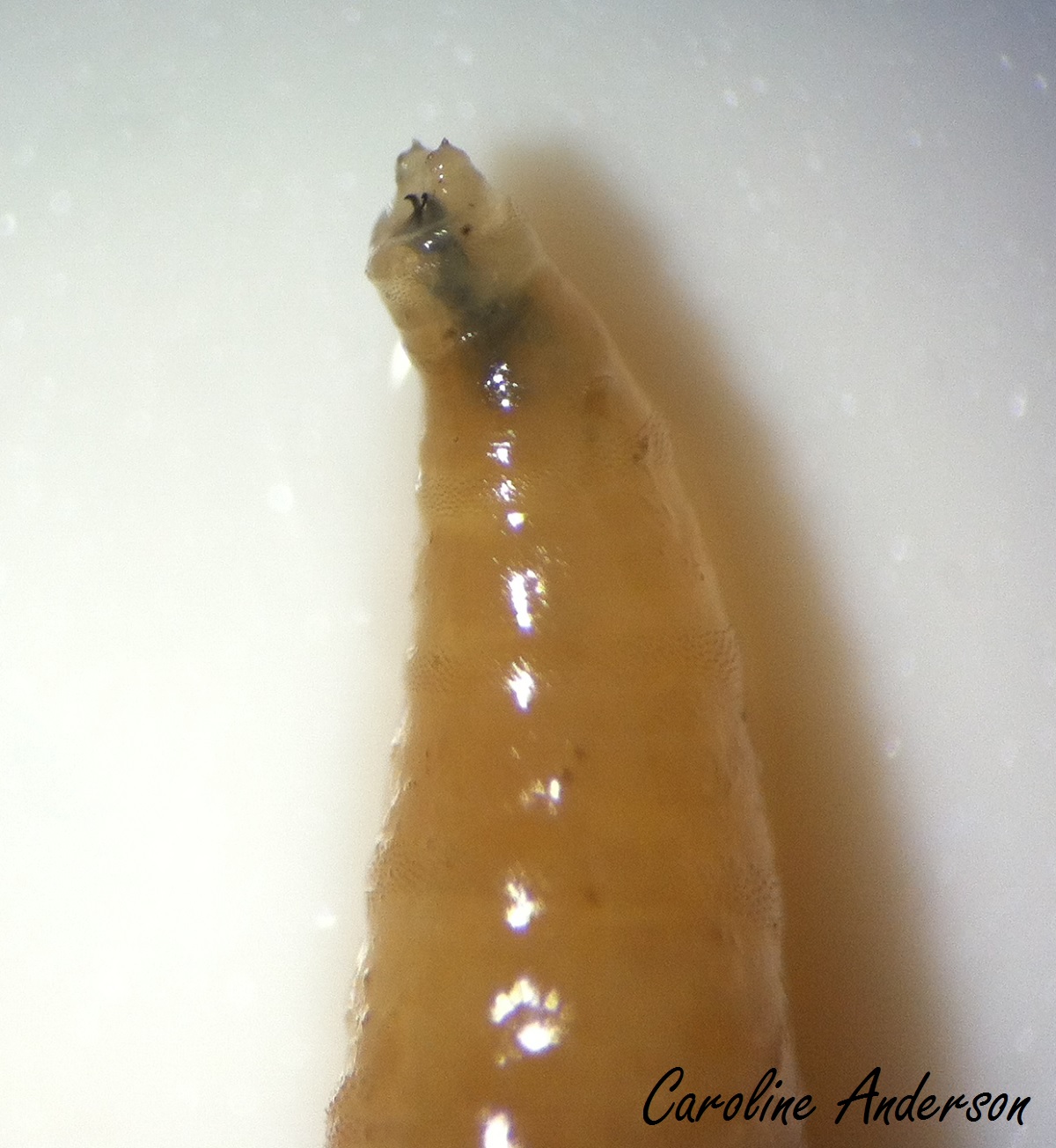 De même, la base des fausses pattes des chenilles arbore des crochets qui sont absents des fausses pattes d’autres larves d’invertébrés, notamment les mouches à scie et divers diptères. Les fausses pattes des diptères qui ressemblent aux chenilles présentent aussi une disposition qui peut être différente : elles ne sont pas nécessairement situées tout le long de l’abdomen (voir la photo de la larve de chironome plus bas à cet effet). Cela inclut également l’absence totale de pseudopattes comme chez les larves de tipules. De plus, les larves de diptères ne portent pas de « vraies » pattes et, selon l’espèce concernée, la tête peut s’avérer être très réduite (comme une larve d’asticot, par exemple).