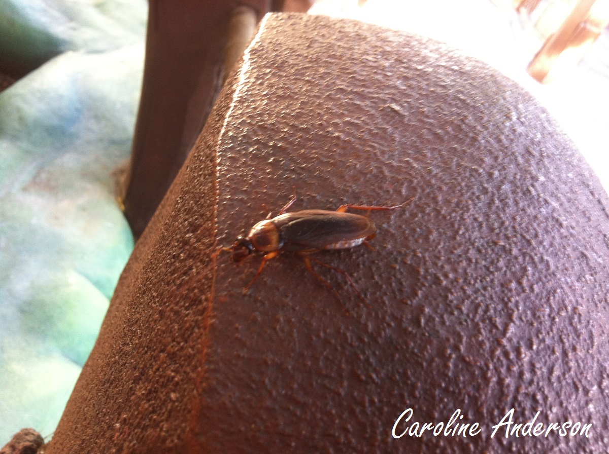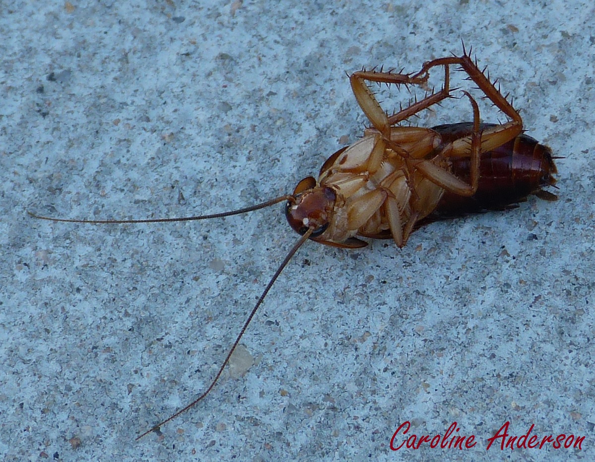 Ma seconde observation se fit dans une rue près d’où nos neveux demeurent. La coquerelle en question avait dû être blessée et gisait sur le dos, bougeant lentement des pattes. Je pris une vidéo que vous pourrez visionner ci-dessous. Encore une fois, la bête était de bonne taille. J’ai rapporté cette observation à ma belle-sœur qui m’indiqua que les coquerelles sont tellement communes qu’elles sont facilement visibles : dès que le soleil se couche, elles ne se gênent pas pour ramper à côté de vous si vous êtes confortablement installés à l’extérieur. Malheureusement, ces insectes cherchent également à entrer dans les maisons lors des changements de saison. À ce qu’il semble, les exterminateurs sont bien occupés dans ce coin de pays au printemps et à l’automne.