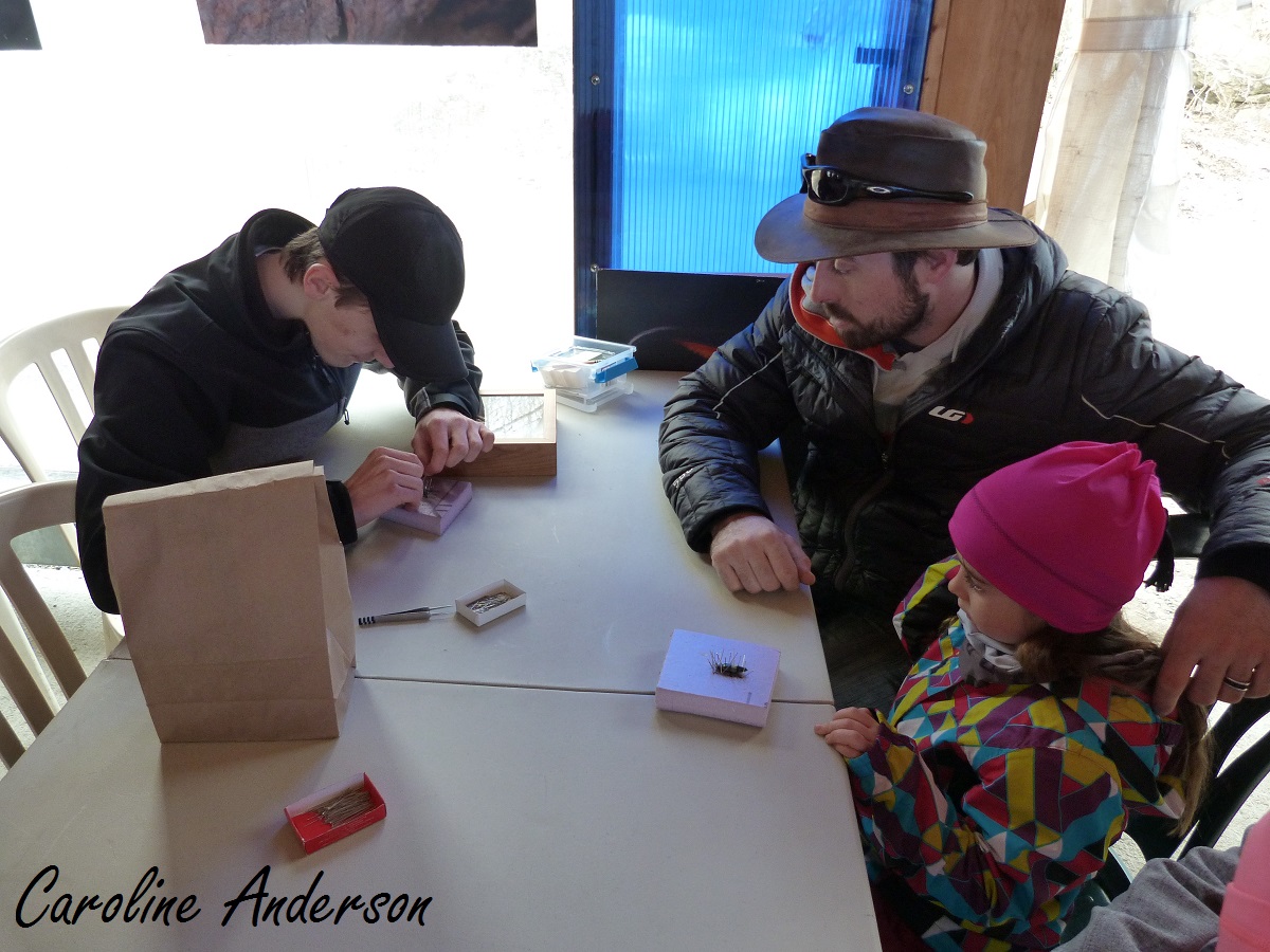 Une volière à papillons constituait également un des attraits du festival. Quelques espèces de saturnidés s’y laissaient observer. Immédiatement à côté de la volière se trouvait la « salle » d’épinglage où l’on pouvait voir des bénévoles aider des participants à faire le montage de leurs insectes séchés nouvellement acquis.