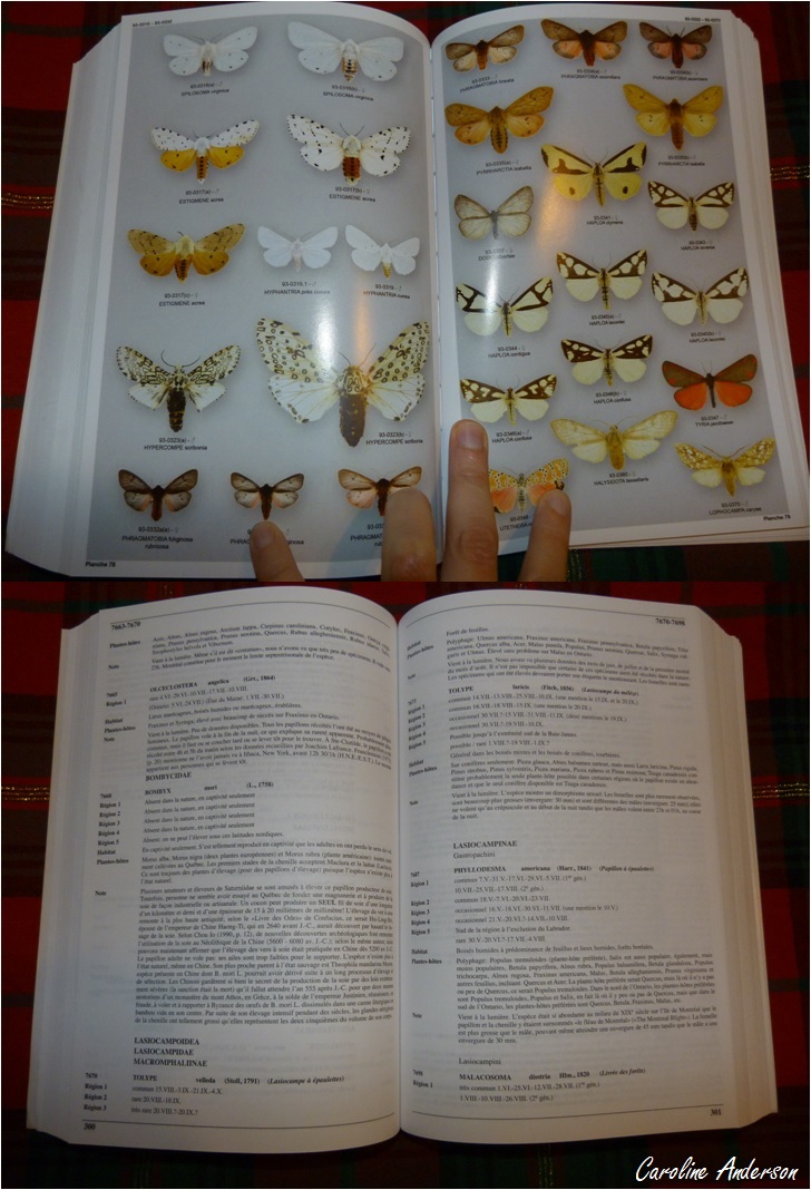 Le second livre que je vous suggère est rédigé par un auteur québécois : « Les papillons du Québec » par Louis Handfield (2011). Cet ouvrage constitue une vraie mine d’or d’information tant au sujet des papillons diurnes que nocturnes retrouvés au Québec. Vous cherchez à identifier un papillon que vous avez collecté ou pris en photo? Les planches disposées à la fin du livre présentent 1521 espèces retrouvées au Québec. Presque tout ce qui reste du bouquin est réservé à la description des espèces : nom latin et français (s’il y a lieu), observations par mois et par région du Québec, habitats fréquentés, espèces semblables et notes pertinentes.