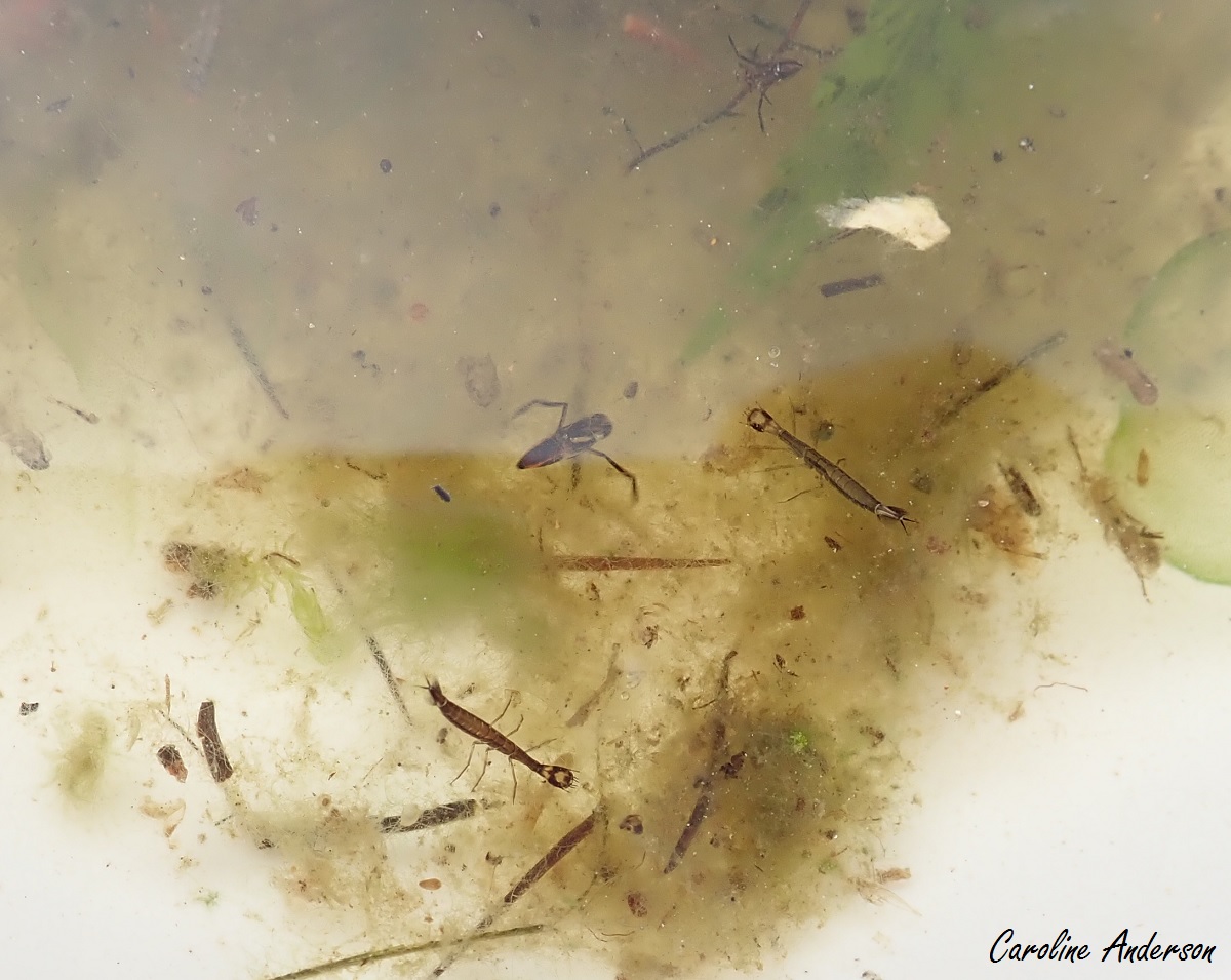 L’exutoire du lac – un petit ruisseau – comportait une bien plus grande diversité d’organismes : écrevisses, trichoptères, éphémères, mégaloptères, odonates et plécoptères, notamment, étaient au rendez-vous. Il en fut de même pour les abords de la tourbière : en quelques coups de filet, nous fûmes en mesure d’observer une grande diversité et densité d’organismes tels que libellules (zygoptères et anisoptères), corises (Corixidae) et larves de dytiques.