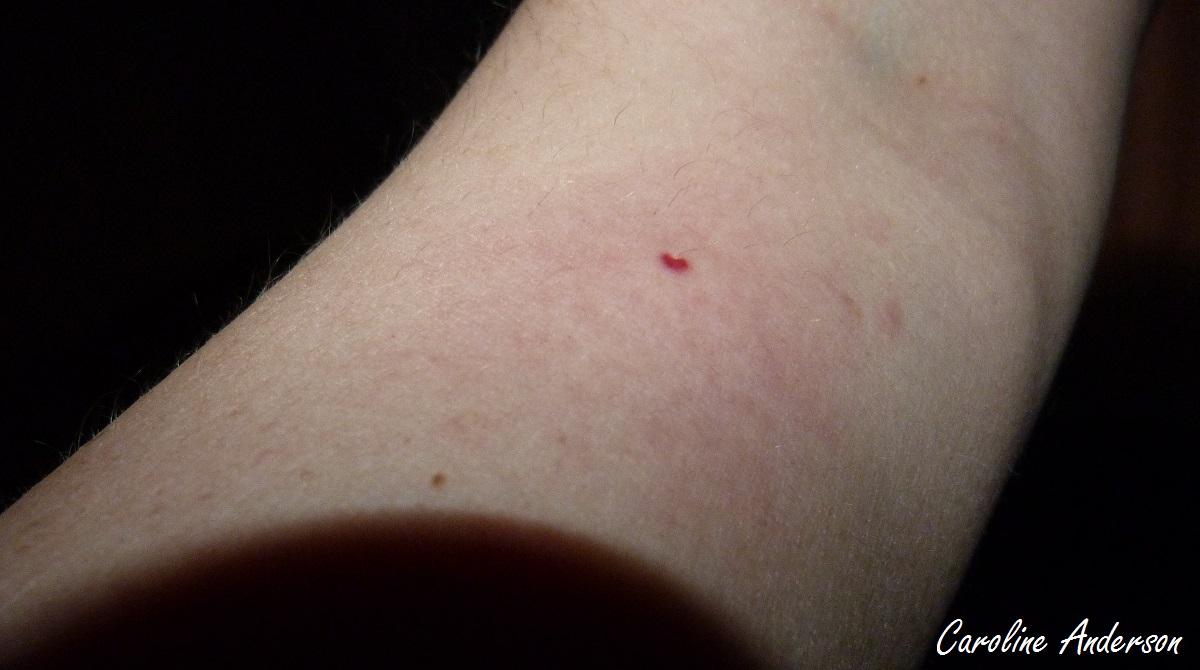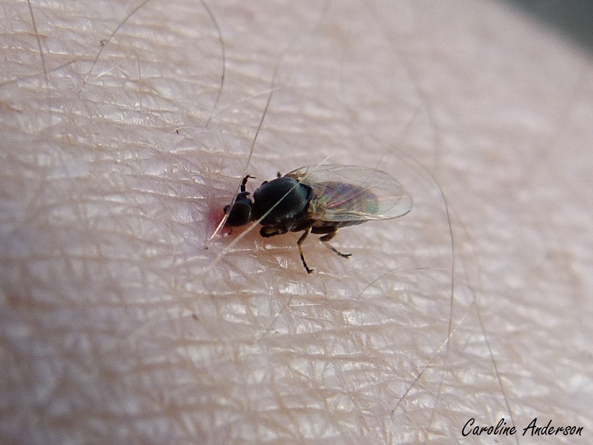 Pendant ce séjour, je me suis constituée une vaste collection de piqûres de toutes sortes. J’ai également pris des photographies et une vidéo d’une simulie à l’œuvre, en train de me croquer! Ce que je notai, c’est que je réagissais nettement plus aux piqûres de ces simulies, les Tabanidae – pourtant beaucoup plus gros – venant en deuxième et les maringouins, en dernière position. La morsure des simulies produisait chez moi un petit point très rouge, lequel devenait rapidement entouré d’une zone enflée de la taille d’une pièce de 2 dollars. Le tout piquait pendant 2 à 3 jours, avec une sensation d’échauffement omniprésent pendant les premières 24 heures. L’application de deux différents produits « anti-démangeaison » n’apportait que très peu de soulagement.