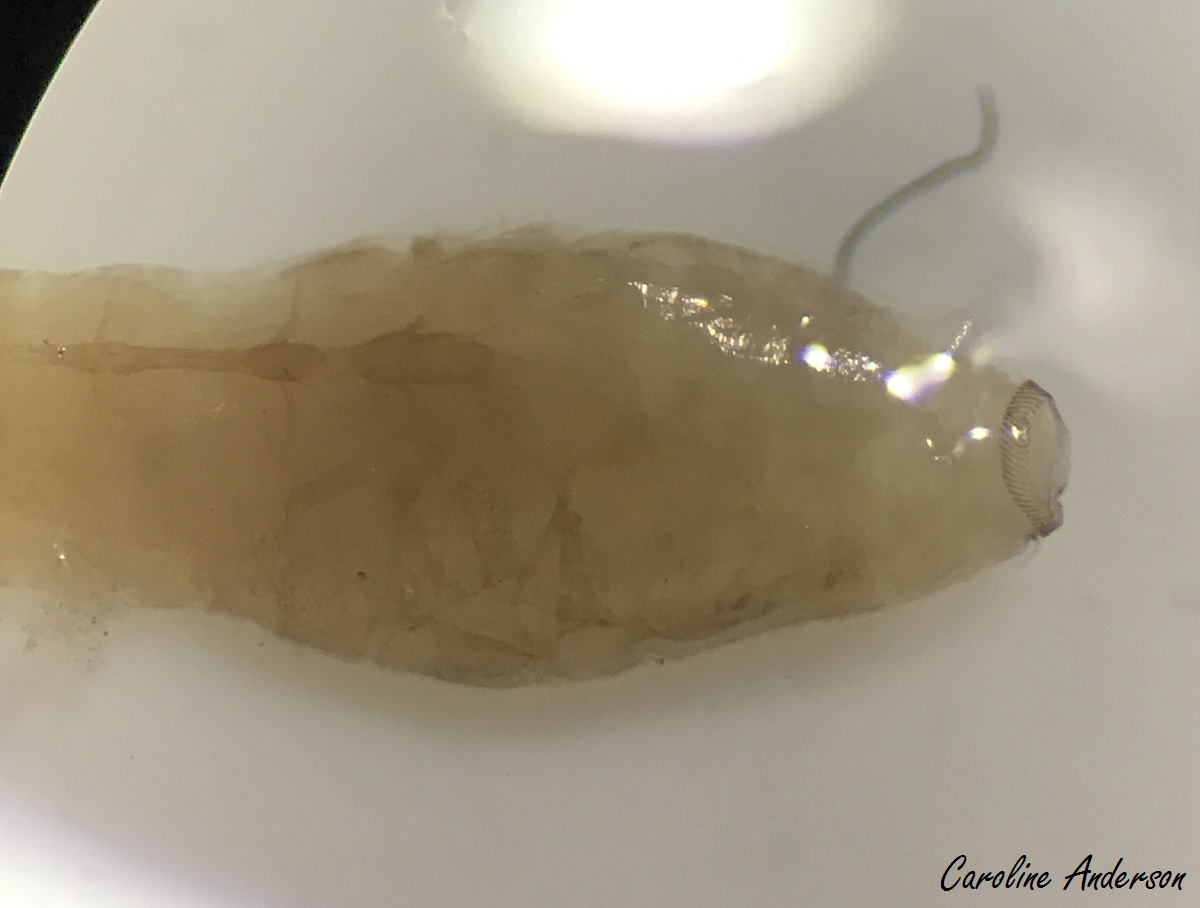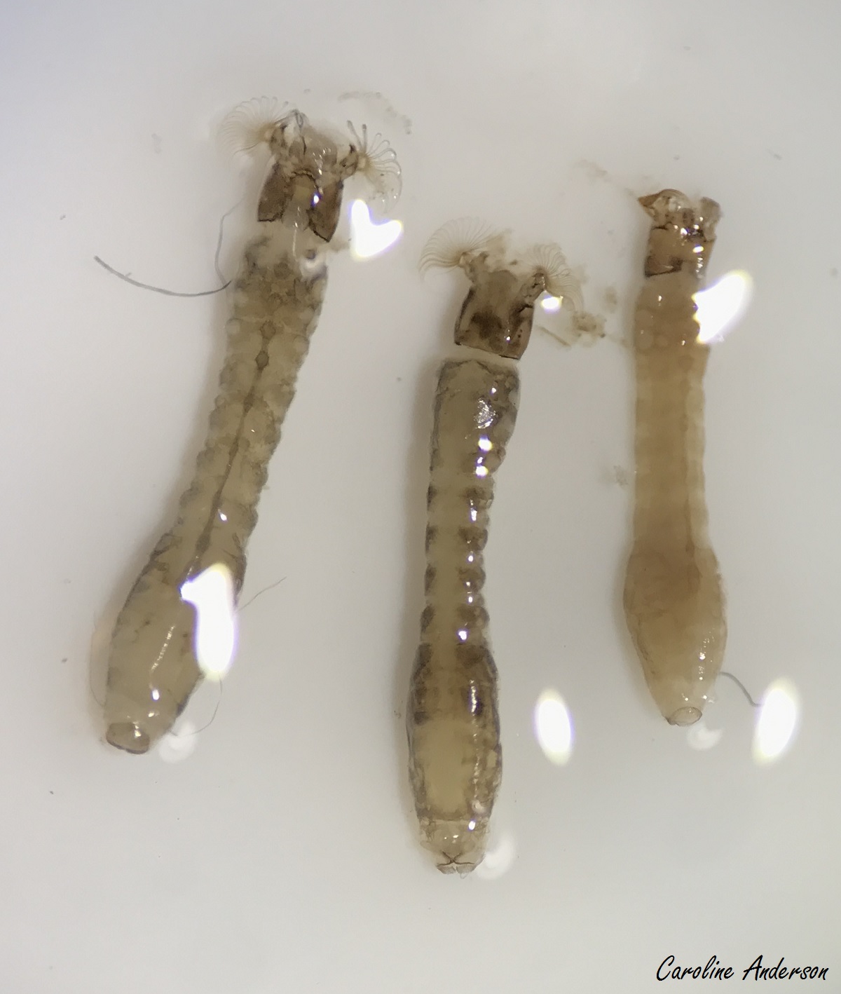 Les larves possèdent d’autres caractéristiques étonnantes. Comme je le présentais dans la devinette de la semaine dernière, elles sont munies d’un étrange éventail, situé de chaque côté de la bouche, appelé labial fan par les sources anglophones que j’ai consultées. Je me demandais quelle pouvait bien être la traduction française de ce terme lorsque je tombai sur Moisan (2010) qui les qualifie de « panaches de soies ». Me voilà maintenant plus instruite!