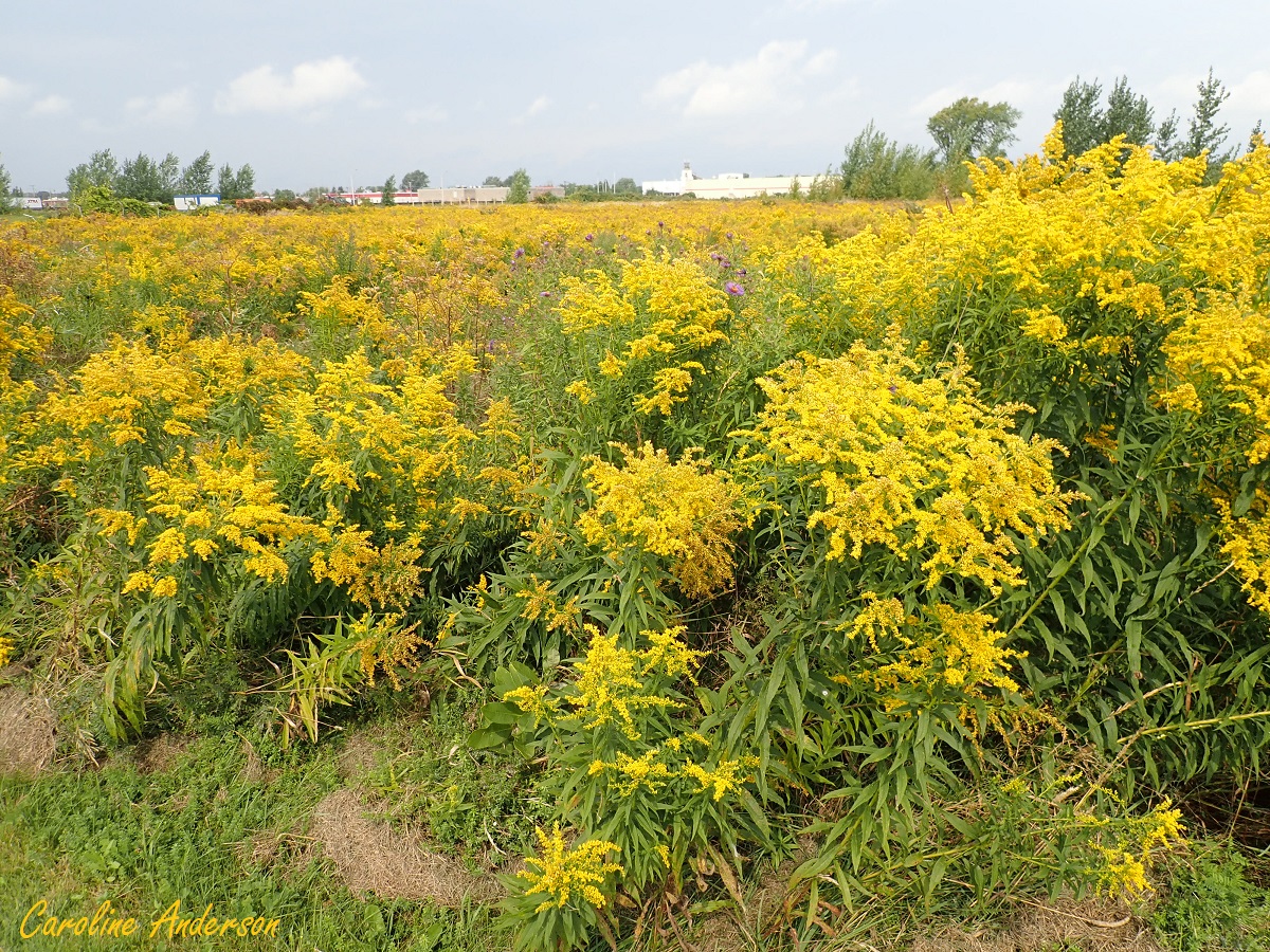 Bref, je fis donc la connaissance de notre insecte-vedette en 2016, par le biais d’une photographie transmise par mon père. Curieuse, j’en profitai lors d’une visite chez mes parents au début du mois de septembre de la même année pour me balader dans les environs et je pus enfin rencontrer en personne cet insecte qui m’était inconnu… bien que pourtant fort commun! C’est le long d’un chemin de fer, bordé de très nombreuses plantes herbacées, que j’observai donc mes premières cantharides de Pennsylvanie. Celles-ci étaient très abondantes et, visiblement, en période de reproduction. Elles se voyaient par dizaines dans des plants de verges d’or (Solidago sp.), qui constitue d’ailleurs une de leur plante favorite!