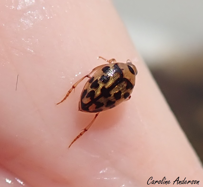 Les deux genres susmentionnés (Haliplus et Peltodytes) sont d’ailleurs ceux que l’on retrouve dans les eaux québécoises. Lors d’une conférence de l’Association des entomologistes amateurs du Québec en 2019 (Tessier 2019), le présentateur attirait notre attention sur les taches présentes sur le pronotum (segment situé immédiatement derrière la tête) : ces dernières peuvent servir de critère visuel rapide pour discriminer entre les deux genres. Il est si simple qu’on peut l’utiliser pour des photographies, sans avoir à tuer et préserver le spécimen. En effet, le genre Haliplus présente généralement une tache noire dans le haut du pronotum (toutes les photos d’adultes que j’ai prises et qui accompagnent ce billet), alors que le genre Peltodytes présente typiquement deux taches noires au bas de celui-ci (cet exemple tiré de Bugguide).