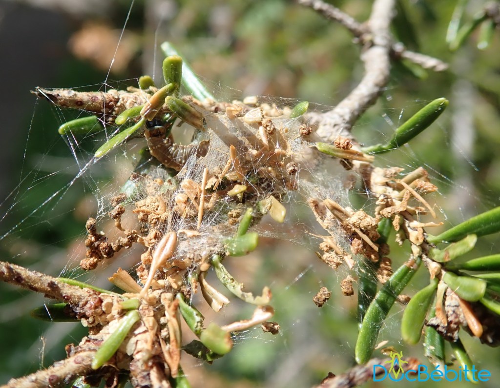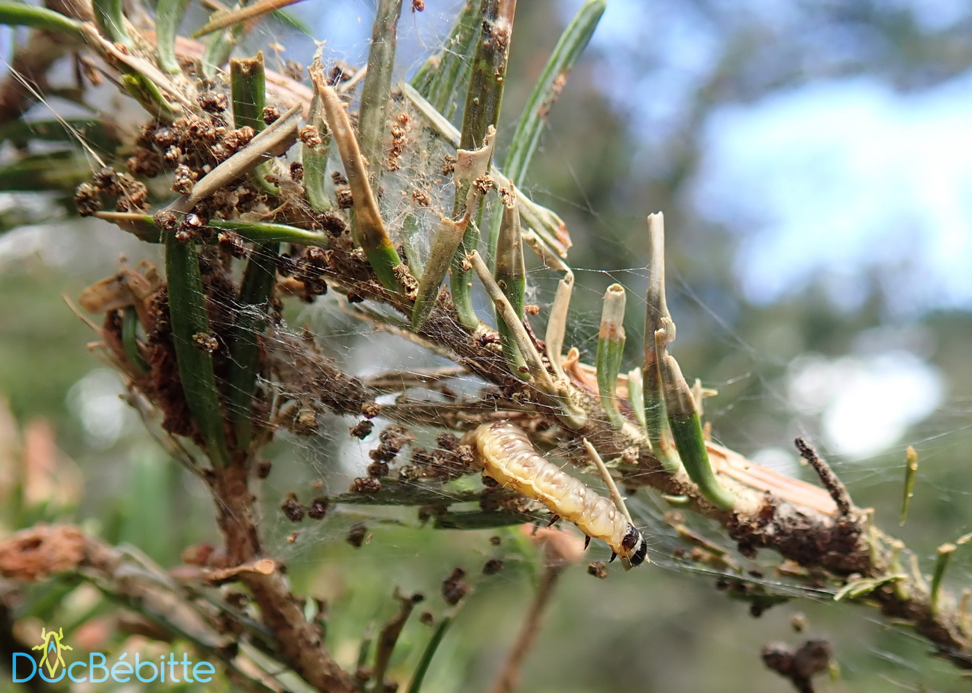 Celles aperçues au début du mois de juillet en étaient vraisemblablement à leur dernier stade larvaire – qui s’observe généralement vers la fin juin. Elles dévorent les nouvelles pousses des conifères, confortablement installées dans l’abri qu’elles tissent et qui se compose également de leurs déjections, de débris et d’aiguilles.