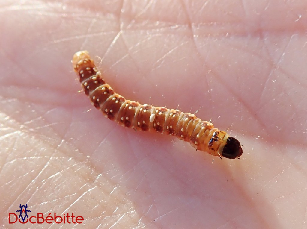 La chenille est brune ou verdâtre tachetée de blanc ou blanc crème. Sa tête est noire ou brune. Les chenilles matures atteignent 25 mm.