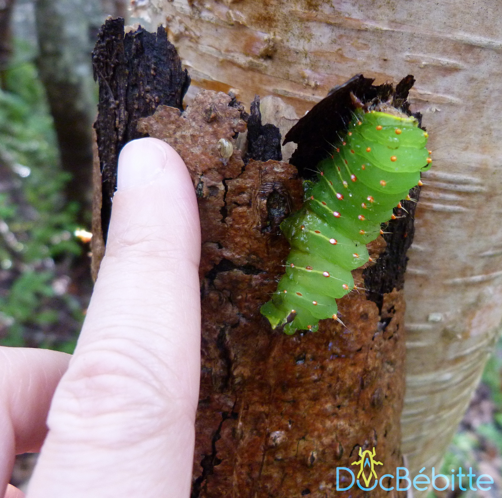 Verte, ornée de tubercules oranges, elle se distingue aisément de la plupart des autres espèces. Elle peut être confondue avec la chenille du papillon lune (Actias Luna), laquelle porte cependant une bande longitudinale jaune que l’on ne retrouve pas chez le polyphème. De plus, la chenille du polyphème a une tête brune, alors que celle du papillon lune est verte. Dernier truc : les bandes jaunes obliques qui parsèment l’abdomen se situent au niveau des stigmates chez le polyphème, alors qu’elles sont logées entre chaque segment abdominal chez le papillon lune.