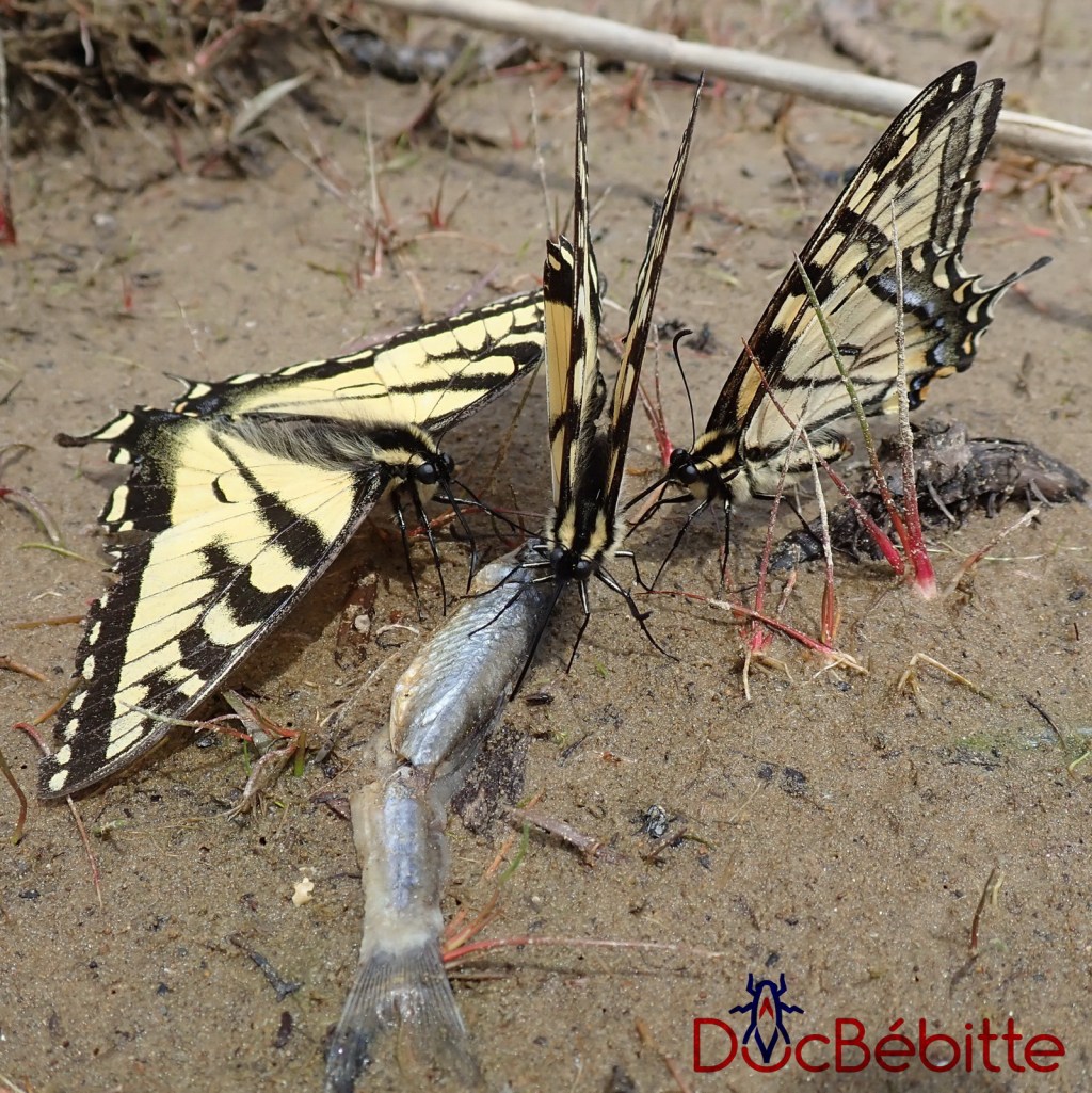 D’ailleurs, Handfield (2011) fait état, dans son ouvrage, d’observations de nombreux papillons tigrés du Canada massés autour de mares d’eau pour en tirer du sodium, ou encore se nourrissant de fumier, d’excréments de chiens et d’animaux en décomposition.