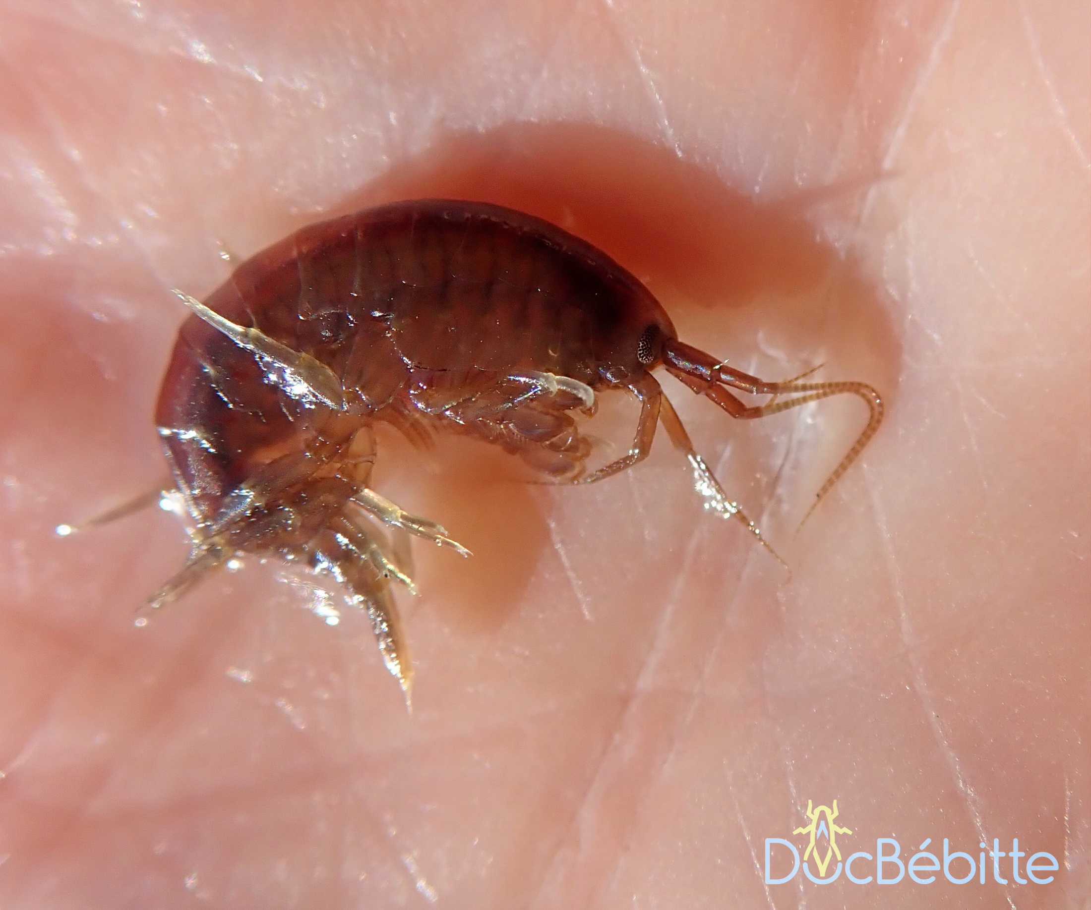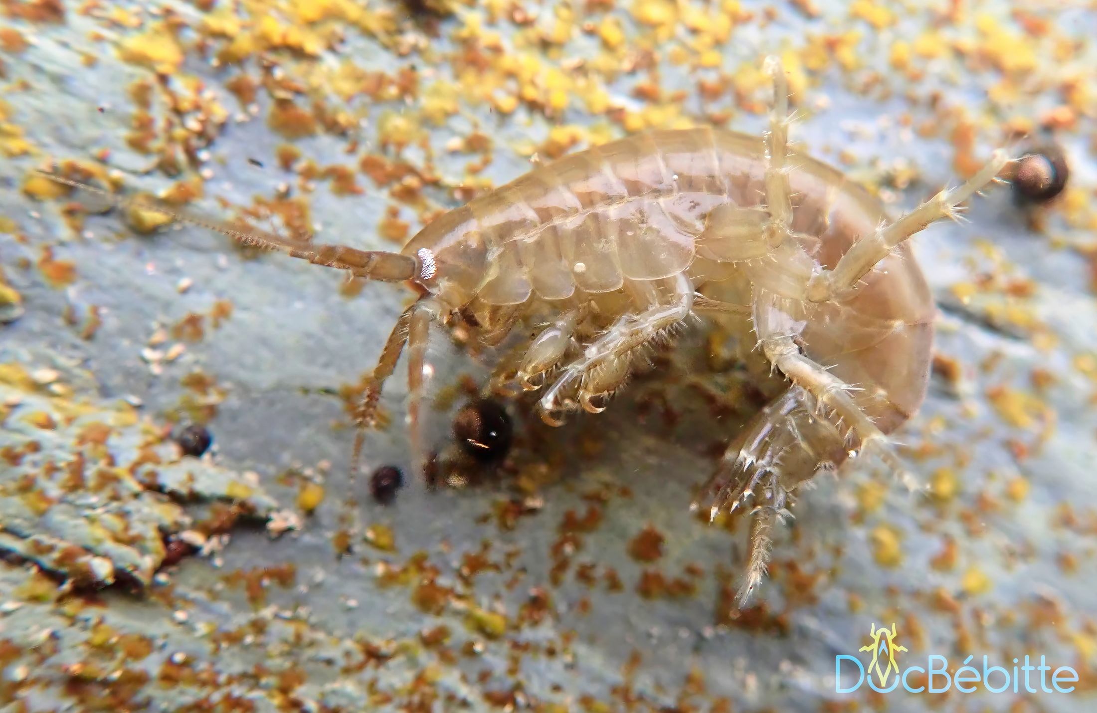 Ils possèdent deux antennes et de nombreuses paires de pattes. Lorsque je me suis renseignée sur leur morphologie, j’ai remarqué que Voshell (2002) identifiait sept paires de pattes, alors que Thorp et Covich (2001) en considéraient cinq. Cette confusion semble liée à la multiplicité des pattes dont la forme et la fonction sont variées. En réalité, on dénombre encore plus d’appendices, qui ont chacun leur utilité : ils servent à saisir (gnathopodes), à marcher (périopodes), à nager (pléopodes) et à manœuvrer, tels des gouvernails (uropodes).