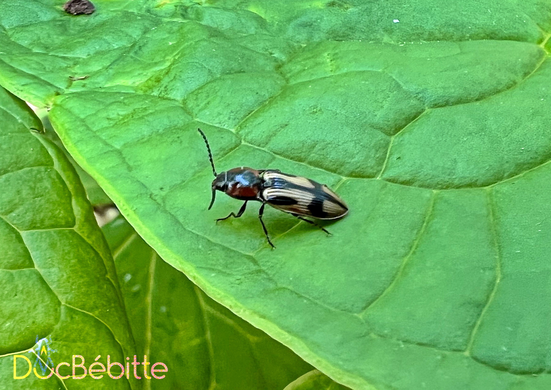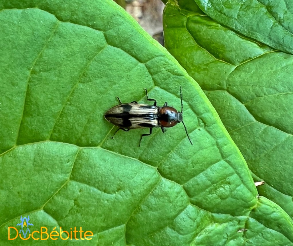 C’est donc samedi dernier, en marchant dans un boisé urbain, que je me suis laissée aller à observer le monde du petit qui s’offrait à moi ! Et je fus gâtée : un joli coléoptère que je ne pensais pas avoir déjà vu se tenait là, devant moi, bien à la vue sur une feuille de trille rouge.