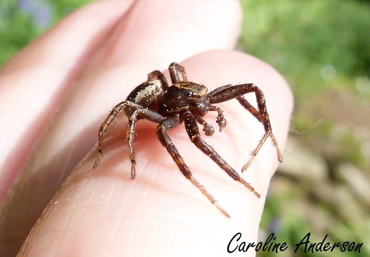 Lorsque j’enlève l’épaisse couche de feuilles recouvrant mes plates-bandes, j’ai aussi le plaisir de découvrir bon nombre de jolies araignées-crabes (Thomisidae). Elles sont à peine visibles, car elles se fondent bien au décor avec leurs couleurs beige et brun. Je retrouve en particulier plusieurs individus que j’avais identifiés dans le passé comme étant de l’espèce Xysticus elegans (voir cette chronique), une araignée dont le mâle arbore de jolis motifs sur son abdomen. Les araignées-crabe chassent à vue, sans l’aide d’une toile. Elles attendent patiemment, au sol ou sur la végétation, le passage d’une proie à laquelle elles s’agrippent le temps venu! Comme elles sont des prédateurs hors pair, elles contribuent à la régulation des populations d’espèces d’insectes qui pourraient autrement s’avérer néfastes. C’est d’ailleurs le cas de nombreux autres arachnides qui foulent nos plates-bandes ou qui y tissent leur toile : opilions, araignées-loup (Lycosidae), Agelenidae et j’en passe!