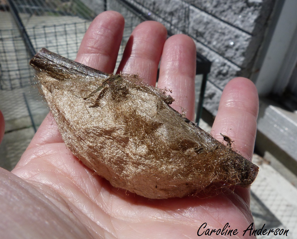 Je mis le cocon dans un pot Masson, lui-même disposé dans une poubelle en métal où je garde les graines d’oiseaux, étant donné que ma remise est assiégée l’hiver par des souris. Mignonnes… mais dévastatrices! À ce qu’il paraît, mon cocon aurait pu servir de repas à ces dernières s’il n’avait pas été protégé.
