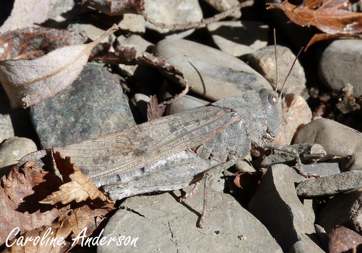 Toujours dans le parc, tout près de notre point de départ lors de la première journée, un criquet que je ne connaissais pas se prélassait au soleil. Je pus en prendre également plusieurs clichés, ce qui me permit de l’identifier comme étant fort probablement un Trimerotropis pallidipennis, le Pallid-winged grasshopper (voir addenda dans la chronique du 14 avril à cet effet: il s’agirait finalement d’un individu du genre Anconia). Il s’agit encore une fois d’une espèce associée aux zones désertiques, en particulier aux secteurs parsemés de petits buissons et de graminées. La coloration tachetée de brun et de beige de cet orthoptère le rend assez difficile à voir contre le sol graveleux et rocheux du désert américain. Heureusement pour moi, l’individu observé était confortablement installé en plein milieu d’un sentier pédestre asphalté, tout près du pavillon des visiteurs.