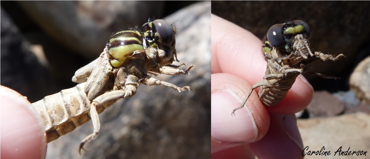 Sur la photographie mise en vedette, on est en mesure de déterminer que l’individu est un gomphe (famille Gomphidae). Je suis capable d’identifier ce spécimen à la famille, pour ma part, à partir de l’exuvie. Les naïades et exuvies vides de gomphes sont faciles à identifier à cause de la forme de leurs antennes. J’avais déjà fait part des critères d’identification dans cette précédente chronique, si le sujet vous intéresse (je ne me répéterai pas ici)!