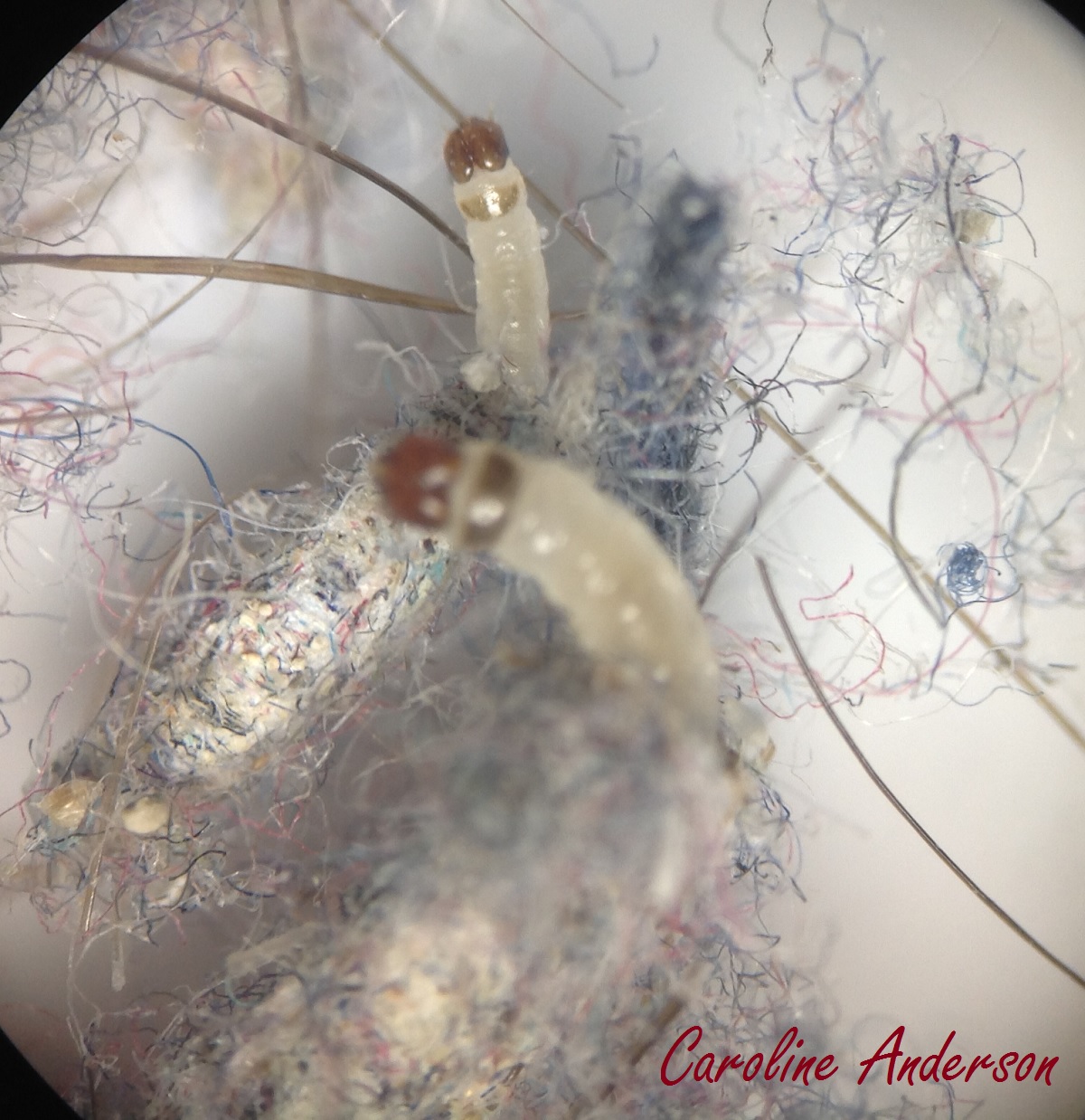 Aux printemps 2011 et 2012, nous avions observé quelques très petits papillons (10 à 15 millimètres) brun-beige qui se promenaient dans la maison, sans plus. À l’été 2013, surprise, nous nous sommes retrouvés avec 5 à 7 papillons par jour pendant deux ou trois mois. Nous avons scruté tapis, dessous de meubles et autres recoins sans réussir à trouver la source. Or, en décembre 2013, je tombai sur une toute petite chenille enveloppée d’un fourreau laineux qui grimpait le long du mur de la salle de bain (voir la première vidéo à la fin de la chronique). En l’examinant sous le microscope je compris 1) qu’il s’agissait d’une mite des vêtements porte-case (on la nomme aussi « teigne ») et 2) que son joli fourreau arborait des couleurs que l’on retrouvait… dans les couvertes de notre lit! C’est à ce moment que nous eûmes l’idée de tirer le lit et d’examiner en dessous. Ouf! Quel spectacle nous eûmes, voyant tout un tas de petites chenilles entrelacées avec brindilles de tissus et de poussière!