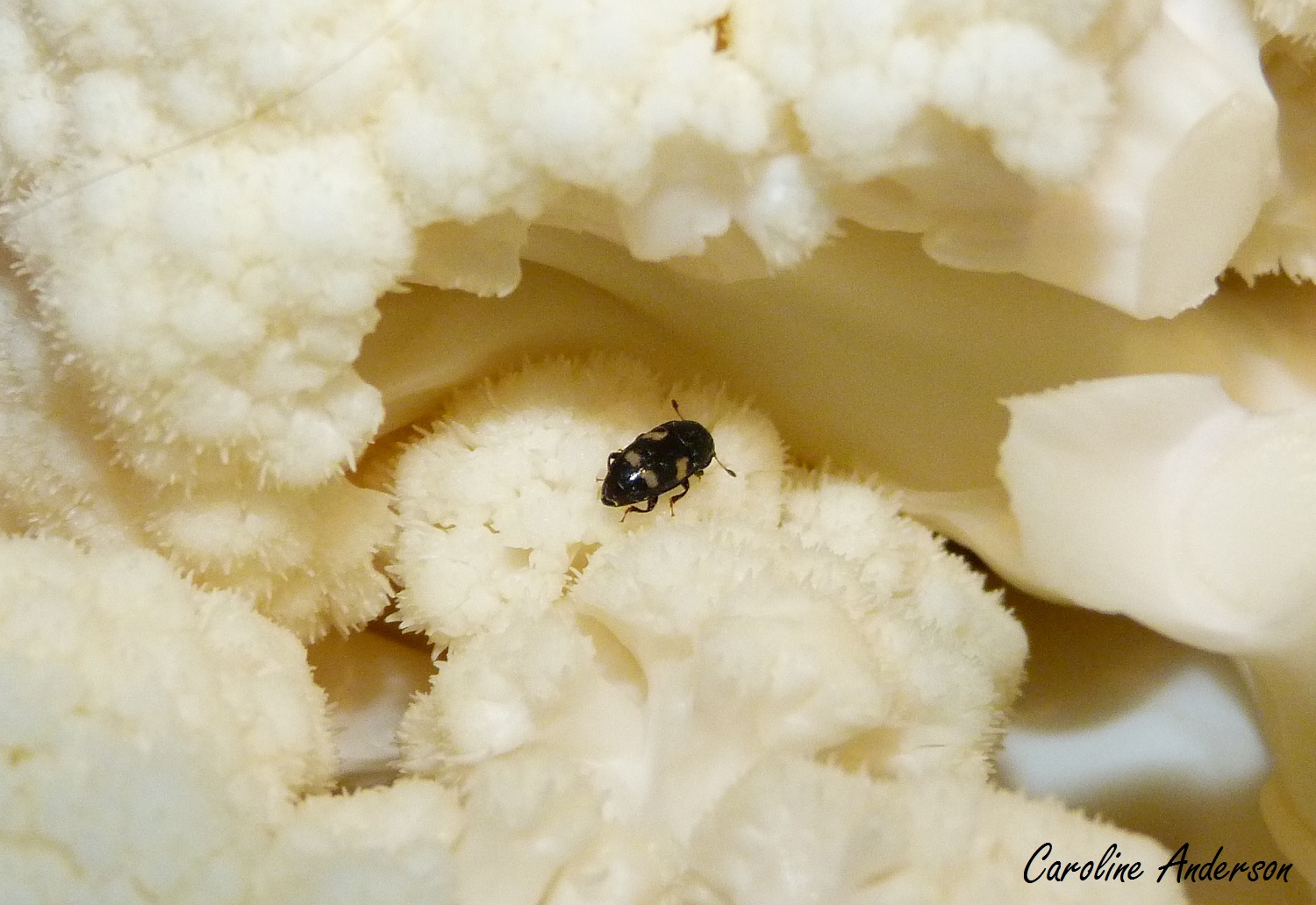 Première observation : après avoir entamé un chou-fleur frais acheté du marché public, j’observai plusieurs invertébrés morts ou vivants qui parsemaient ce dernier. Ma première découverte fut un nitidule à quatre points bien vivant qui aurait été difficile à rater. Après avoir remis le chou-fleur au frigo, je notai lors d’une deuxième utilisation que celui-ci abritait également une sympathique limace, qui s’activa à la chaleur de la pièce, ainsi que plusieurs petites mouches mortes. Outre les petites mouches, il est probable que j’aurais vu le nitidule et la limace à temps avant de les consommer. Or, ce ne fut pas le cas de ma seconde observation…