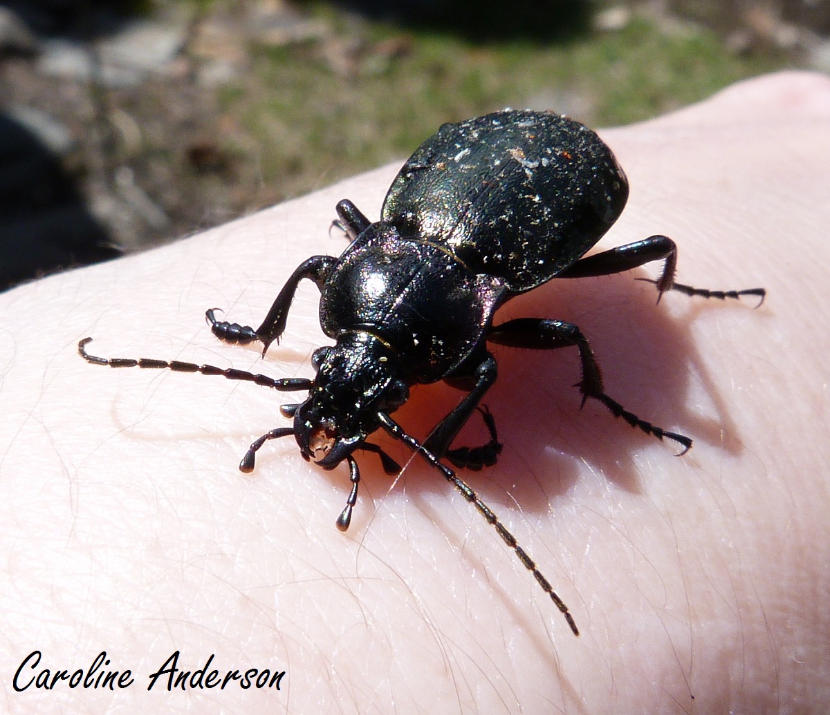 Il n’y a pas que les coccinelles chez les coléoptères qui sont de redoutables prédateurs : les carabes bronzés (Carabus nemoralis) sillonnent aussi nos plates-bandes à l’affut d’une délicieuse collation invertébrée. Ces jolis et gros coléoptères sont notamment friands d’organismes à corps mou comme les limaces, les escargots et les chenilles, des bêtes qui transforment typiquement nos plantes en gruyère suisse tellement elles y font de trous! J’avais observé une quantité impressionnante de carabes bronzés chez ma belle-sœur dont les plates-bandes étaient également envahies par un nombre effarant d’escargots. J’ai présumé qu’il y avait un lien entre l’abondance des proies et des prédateurs respectivement. Avez-vous déjà fait une telle observation?