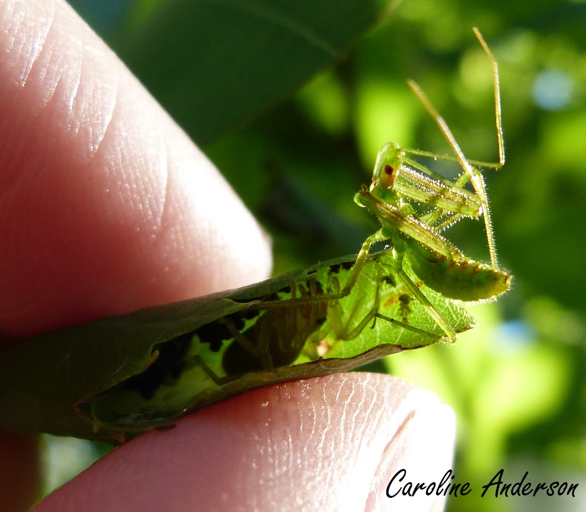 Première observation : la punaise assassine! J’avais fait la rencontre de ce sympathique insecte pour la toute première fois au printemps 2013 et j’en avais alors fait l’objet d’une chronique (celle-ci). Encore une fois cette année, ce sont des nymphes de l’espèce Zelus luridus que je découvris blotties sous les feuilles. J’avais également observé plusieurs nymphes l’automne dernier qui présentaient toutes le même comportement : elles se cachaient à l’intérieur de feuilles dont le bout avait été enroulé par un précédent insecte (possiblement une sorte de chenille). En inspectant les feuilles « enroulées » des arbres d’un secteur près de chez moi, je réalisai que bon nombre d’entre elles étaient peuplées par des nymphes de punaises assassines. J’ai pu prendre quelques photographies du phénomène, dont une en appui diffusée dans la présente chronique. Les punaises assassines sont considérées des alliées parce qu’elles sont des prédateurs : elles se nourrissent notamment d’insectes indésirables susceptibles d’endommager les plantes ornementales et les arbustes tels les chenilles, les asticots et les punaises phytophages.