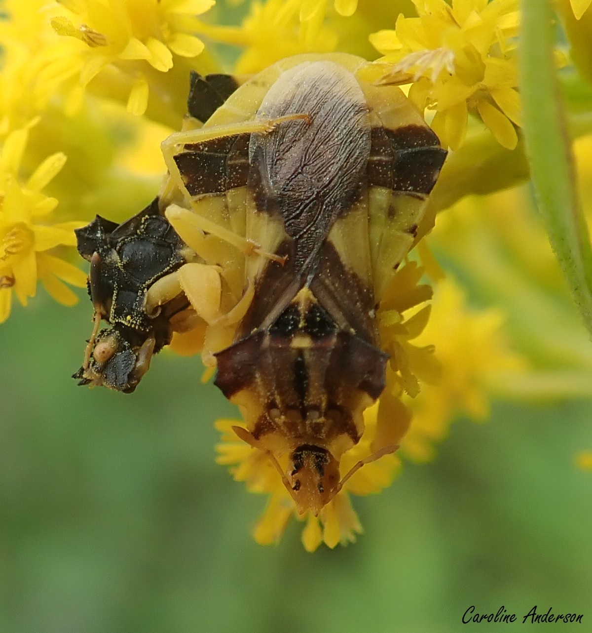 De nombreuses sources indiquent que les membres de la famille Pentatomidae, dont fait partie la punaise euschistoïde, sont réputés pour l’odeur nauséabonde qu’ils dégagent. Il semble que ce soit là un mécanisme de défense bien utile contre les prédateurs. Pourtant, de toutes les fois où j’ai manipulé un pentatome, jamais je ne suis parvenue à sentir l’odeur si caractéristique. Se pourrait-il que certaines personnes ne parviennent pas à détecter cette odeur? Ou peut-être n’ai-je pas suffisamment malmené les spécimens que j’ai manipulés, qui sait? Avez-vous déjà senti leur odeur, de votre côté? Je serais curieuse d’en connaître la réponse!