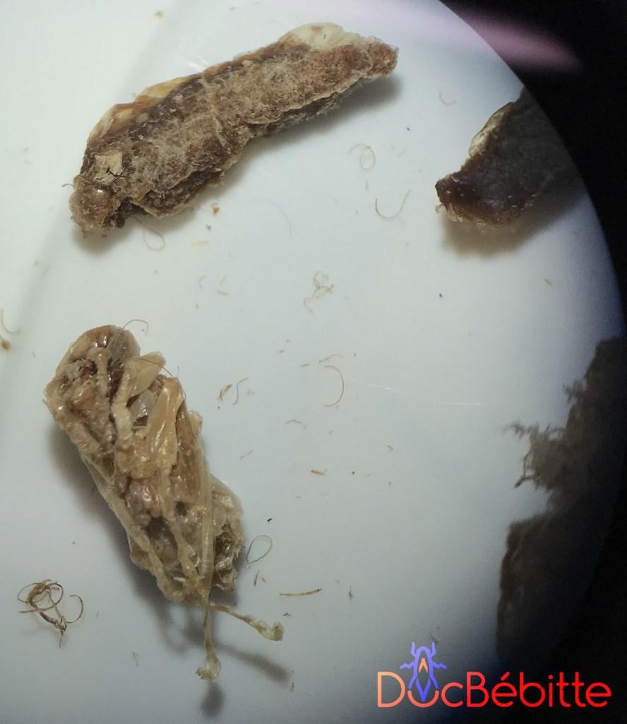 Pupe de trichoptère (haut) et pupes de diptères (bas)