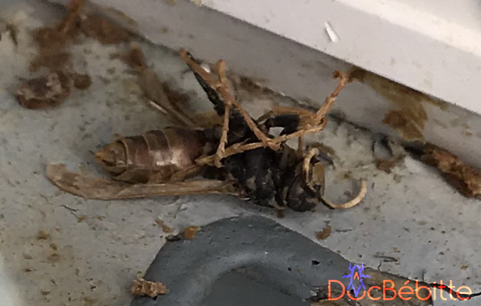 Ledit nid avait dû être aspergé de liquide pour tuer les guêpes, puisqu’on pouvait observer des guêpes mortes jonchant le rebord de porte à proximité. Le nid – et la vie qu’il contenait jadis – était immobile, comme si le temps s’était arrêté.