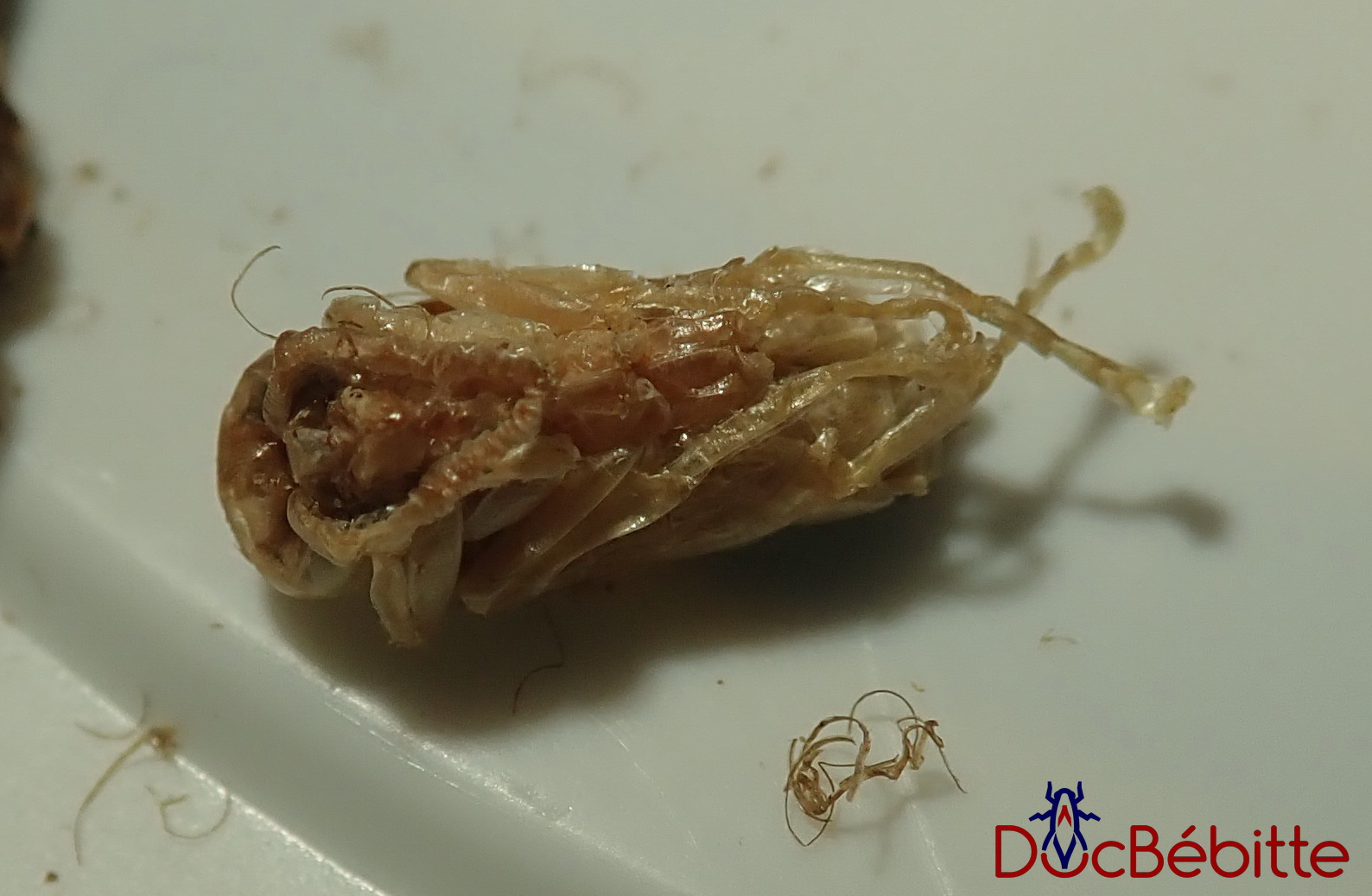 En examinant le nid de plus près, je pus distinguer que, ce qui me semblait être des débris brunâtres était, en fait, des larves de guêpe desséchées. Une pupe, sans doute sur le point d’émerger, était aussi visible.