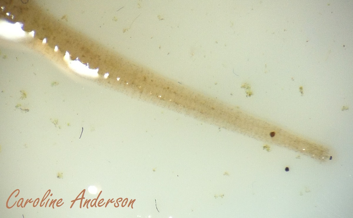 C’est un mélange de curiosité et de pitié pour ces libellules que j’aime tant qui me conduisit à retirer la sangsue de la tête de la naïade. Tenant la sangsue dans une pince, ne tirant celle-ci que très légèrement, je fus surprise de voir qu’elle lâcha prise rapidement. Comme vous le savez, je préfère préserver uniquement les invertébrés trouvés déjà morts dans ma collection. Je me permis cependant une petite entorse à cette habitude afin de pouvoir examiner la sangsue de plus près, sous le stéréomicroscope. Cette dernière se retrouva par conséquent dans une fiole remplie d’alcool… et sous la loupe de mon appareil binoculaire!