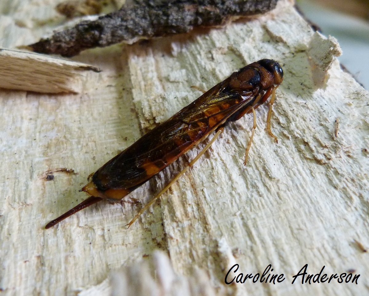 Finalement, j’ai fait la connaissance de Tremex columba, un hyménoptère à l’allure particulière. Le corps robuste et cylindrique, le tremex  n’a pas l’apparence d’un hyménoptère traditionnel à la taille de guêpe. Il s’agit en fait d’un membre du sous-ordre Symphyta, caractérisé par un abdomen fortement réuni au thorax. Le tremex photographié lors du congrès est une femelle. On voit bien son ovipositeur. C’est de cet appendice que se servent les femelles pour pondre leurs œufs dans le bois. Elles favorisent les feuillus tels les érables, les chênes et les hêtres. Contrairement aux deux individus précédents, le tremex est une espèce native. De plus, il préfère les arbres mourants ou morts. Ces deux caractéristiques font en sorte qu’il ne s’agit pas d’une espèce préoccupante. Elle peut même s’avérer bénéfique, puisqu’elle contribue à la décomposition du bois.